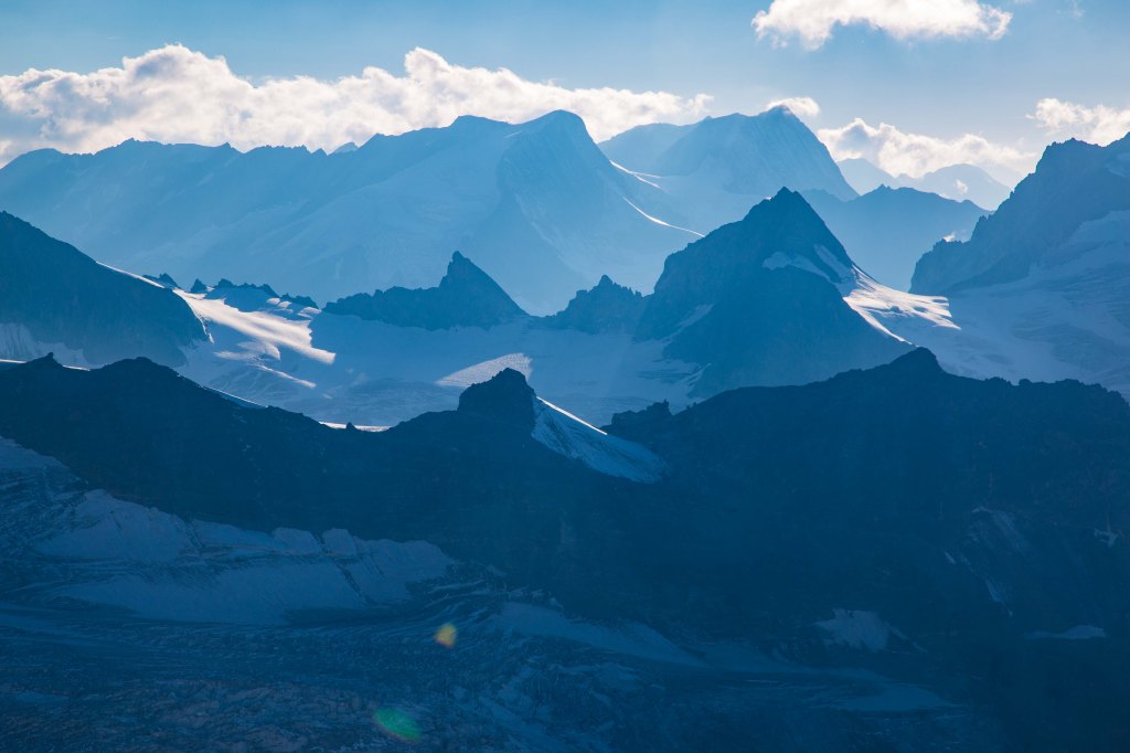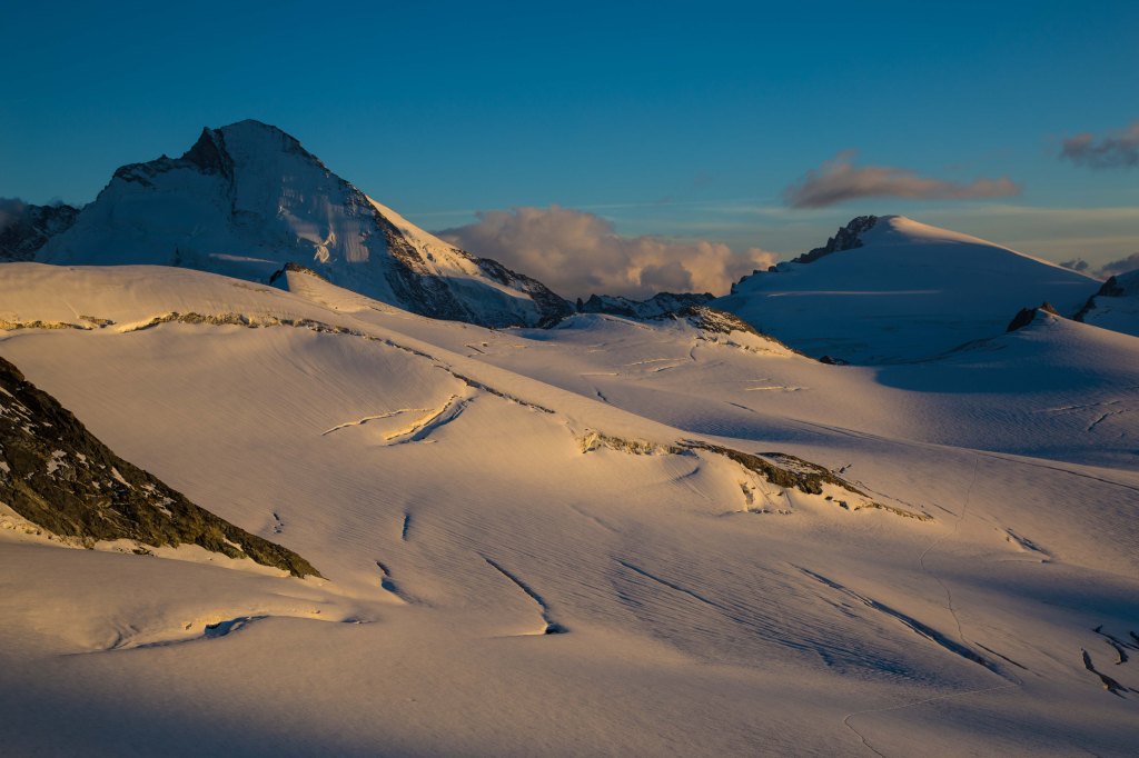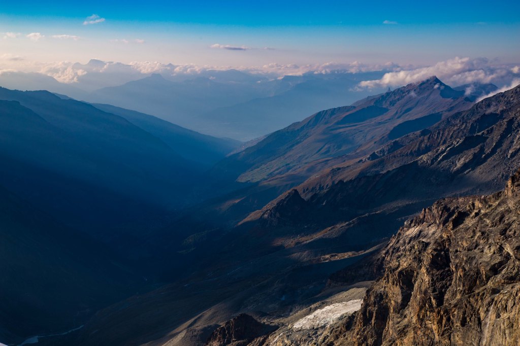 On “Summit Day” we woke late at for a 4:45am breakfast. The cabane sits at 3,500m so I had slept little and got up at 4:00am because I like to “faff” a fair bit first thing. There were 25 people seeking to climb the mountain that day, of which four were mountain guides with clients, including my guide. As there are many tricky sections, our goal was to leave as soon as possible so as not get stuck behind others and hence the need to allow extra time for faffing. We were the 3rd to leave the hut at around 5:15am and there was another pair ahead as well who had “bivvied” that night, sleeping under the stars just below the hut. Sunday morning however was windy, a bit colder with extensive cloud cover.
