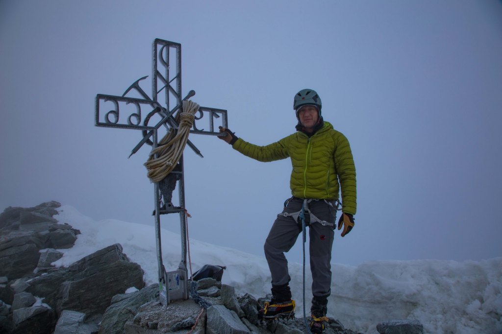 As we climbed higher the temperatures dropped and frost and ice began to form on our jackets, packs and on the rocks. What was once grippy and easy to climb rock began to become icy, slippery and treacherous. We pressed on, but I was having to take much more care and the risks increased but I was still feeling confident and had no doubts that we would reach the summit. Eventually we passed the last of the five gendarmes and the remaining section to the summit was straightforward. Visibility was poor, so we took the quick obligatory summit photograph and began to head back down.