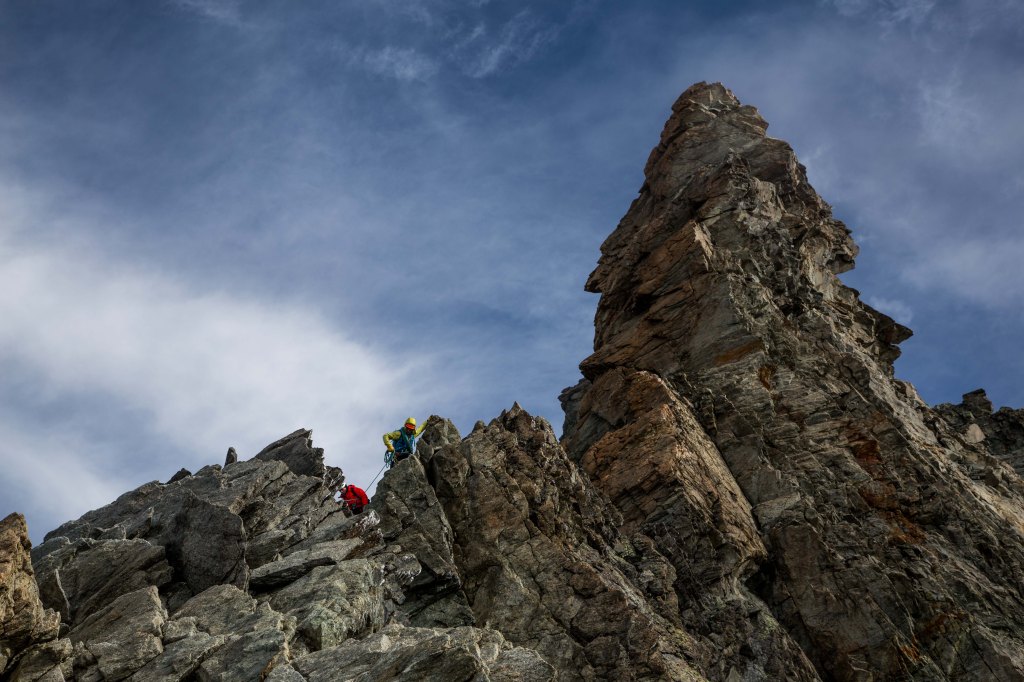 It’s a rocky ridge ascent (the “normal route”) but to reach the summit you either have to skirt around or climb a series of “gendarmes” which guard the route to the summit. These are towering pillars of rock, the most intimidating of which is the “grand gendarme” (see photos). Dent Blanche is supposed to be “up there” with the Matterhorn and other serious mountains in terms of difficulty. Initially however I found the climbing pretty easy and we were moving quickly, opening the gap between us and the following climbers.