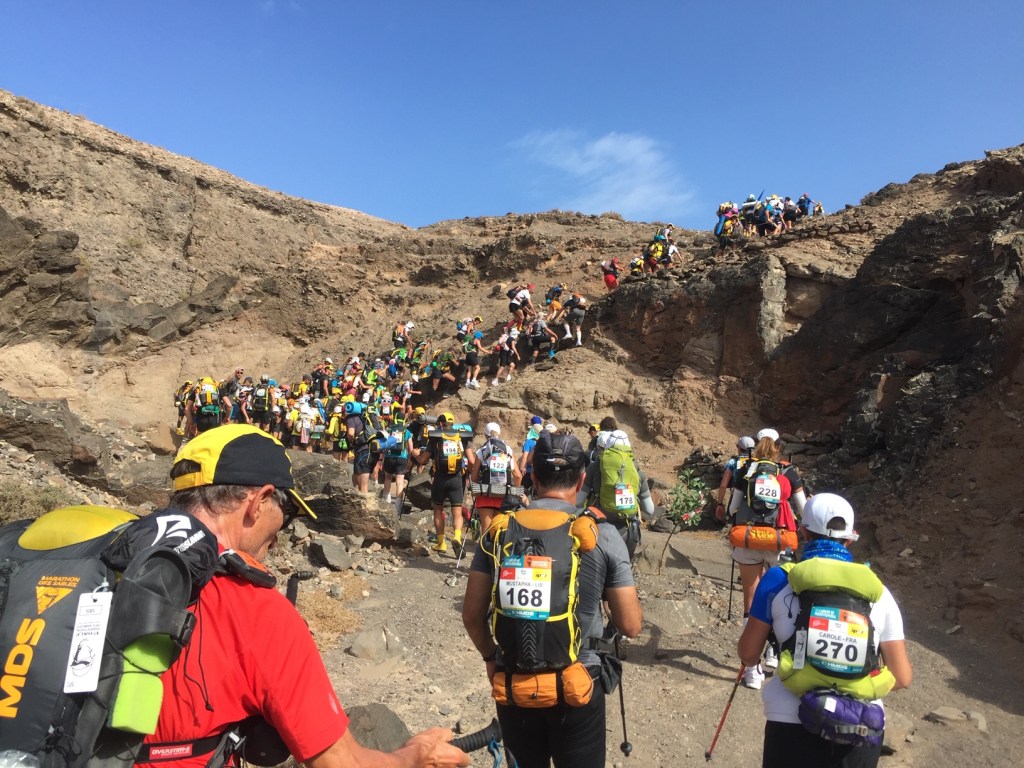 The Marathon Des Sables Half Marathon is billed as three self-sufficient marathons (120 km) over four days in the deserts and “mountains” of Fuerteventura (Canary Islands) with racers seeking stage wins and an overall cumulative time ranking in the General Classification. There were about 275 participants on the start list. Racers carry everything themselves (including food for the four days) except water and a tent. The course was shortened slightly to 110 km consisting of stages of 25km, 65km and 20km but no one complained!