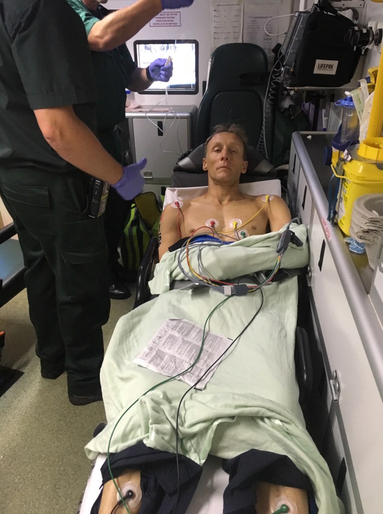 As soon as I crossed the finish line my calf cramped massively and I felt really dizzy. They found me a chair and they called over the medical staff. I was taken to the medical / recovery tent and they gave me soup and I had a couple of slices of pizza and felt much better after an hour. We left and I went to the loo but when I came out the dizziness returned and we went straight back to the tent and lay down. This time they took my pulse which was 170bpm (my resting heart rate is about 38bpm) and tried to take my blood but my veins “had collapsed” due to de-hydration. After finally getting a saline drip into my arm they connected my up to a portable ECG machine and noted some “variations” in my heart which meant they called an ambulance and sent me off to Bolton hospital!