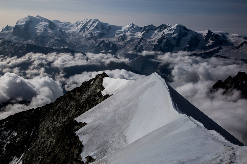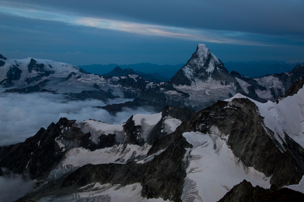 The mountaineering proper then began and I understood why Zinalrothorn is regarded as one of the more serious 4,000 peaks in the Alps. There was one spot which required some reasonably delicate climbing on a rocky slab where, should you fall, you would have had a good few seconds to contemplate the error or your ways before hitting the glacier below. More of the same continued but none of it really unsettled me and suddenly we were on the summit. The views were spectacular with the clouds appearing to be crashing against the rocks below us like an ocean as sunrise. The descent was uneventful and the whole thing was done and dusted in time for morning coffee.