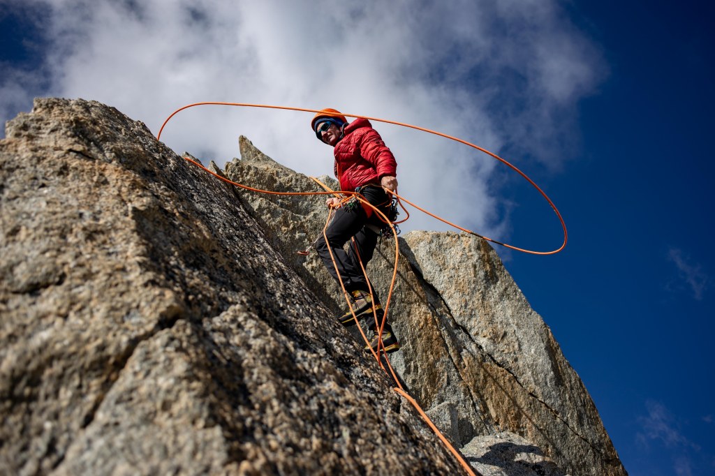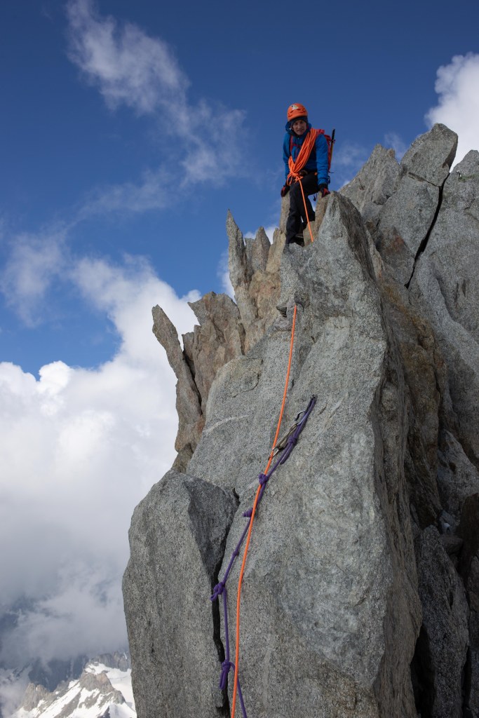 I shouted up to Bertrand over the wind the bad news and he told me to continue climbing. When I arrived at the belay stations, this was the first time I have ever seen him anything other than completely professional – he told me “he would have it out in seconds” as I lowered him backdown to retrieve it. After a good while he climbed back up empty handed and he had the good grace to apologies for his slightly terse words. If he was cheesed off about his belay device, he did not show it and fashioned a belay device from two carabiners.