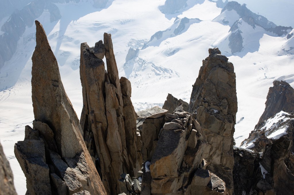 I had asked Bertrand to “step it up” and the traverse of the Aigulles du Diable is graded D+, a significantly higher level than anything I have attempted before and the hardest graded route in my guidebook. A traverse of challenging rock spires encompassing six 4,000m peaks high above the glacial snow and ice of Chamonix.