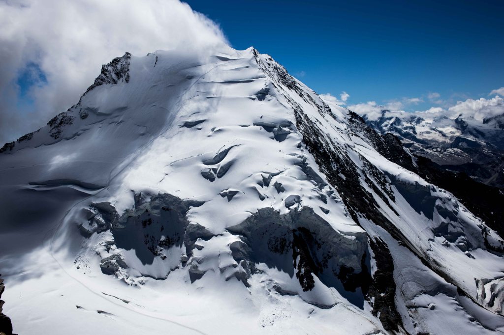 It took for ever to reach the Hobarghorn even though we were moving more effectively together than previous trips. This was partly due to our breaking of the cardinal rule of “never leave the ridge.” My usual guide, Bertrand, had told me that it is almost always best to stay on the ridge – for one, if you are on top of the ridge, other climbers cannot send rocks down on top of your head and secondly, those inviting, easier looking routes off to the slide often end in a sheer drop. A challenging looking section on the ridge prompted us to take an easier looking line to the side which resulted in a difficult and time consuming detour before finally regaining the ridge an hour later – we agreed to adopt the mantra “never leave the ridge”. Finally, we reached our first summit, the Dirruhorn.