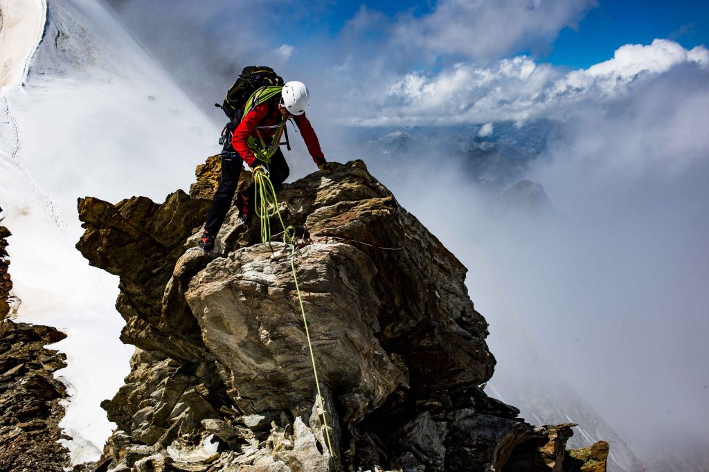 On the final summit I took the lead as not only did I want the practice but I had also learnt that the best mountaineering photos are usually taken when shooting down rather than up. Shooting as the “second” on a mountain simply results in endless photos of your partners arse which is never a good look. I felt confident on the ridge, enjoyed leading and managed to get some better shots. We made it to our final summit, the Stecknadelhorn.