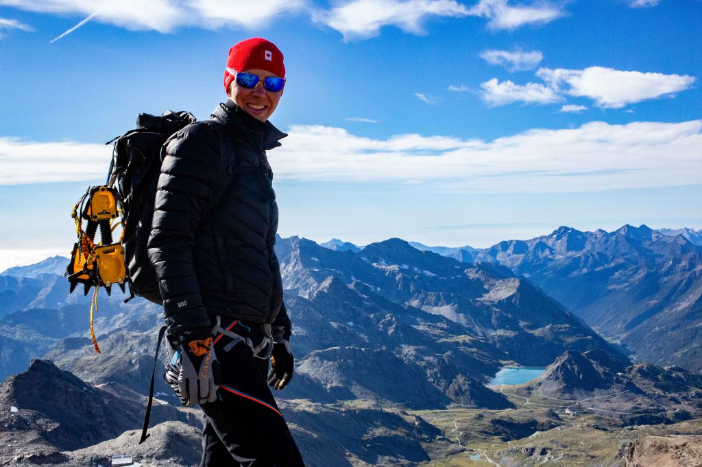 We arrived at the foot of the Parrotspitze and there was a short, steep, nasty icy section. I did not allow any opportunity for discussion but simply explained how we were going to approach it and told Catie what to do. We navigated the ice easily and found ourselves on the relatively gentle and wide snowy ridge. The challenge was the 65 km/hr wind which was cutting through all our clothing and making the whole experience fairly unpleasant. We continued slowly, Catie moving very carefully but effectively. The summit of the Parrotspitze is not particularly well defined and when we felt we had “summitted” we turned around and carefully reversed the route. Catie finally claimed her first 4,000m peak.