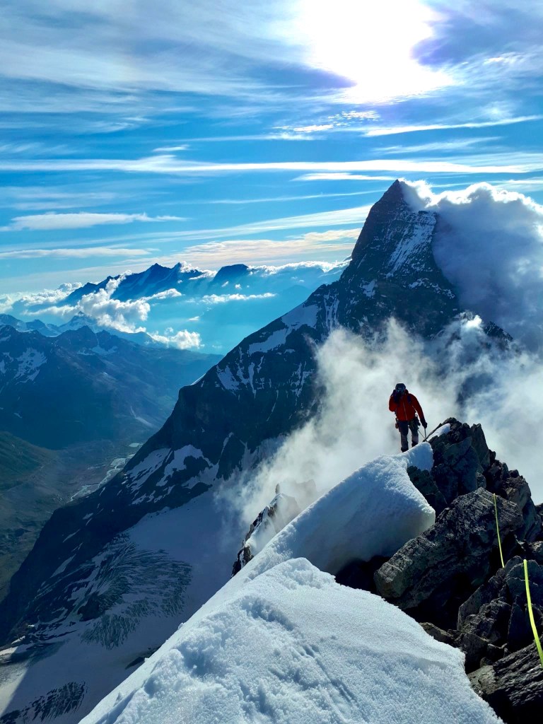We arrived at the East Ridge and began our climb. When we reached the ridge, we had a spectacular view of the Matterhorn as the sun rose from behind, highlighting its very own, personal weather system generating billowing clouds to the South. The guidebooks suggest that the only reason many climb the Dent D’Herens is to gaze across at the Matterhorn.