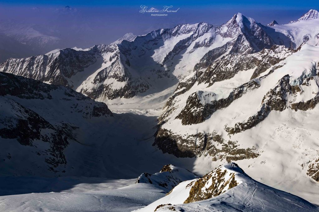 The last few days have been incredibly and un-seasonally warm and so the usually jagged and sharply defined seracs and crevasses have all melted to give the impression that they were painted by Salvador Dali in the style of his “dripping clocks.” Interspersed between these soft, smooth icy formations were small lakes of cobalt blue. I could have spent an entire week photographing this incredible landscape but being late in the day and with the sun now intense the threat from wet avalanches and rockfall was acute. I could not recommend enough a trip to the Aletsch Glacier and a gentle ski tour through this incredible landscape. Eventually we found our exit from the glacier but the only way out was another skin of 300m in the baking sun and wet avalanches representing a credible threat. We took the safest line and needed just under the hour to climb what would normally take me about 20 to 25 minutes. We finished in the ski resort of Rierderalp and a cable car, bus and train took us to Blatten and then finally a taxi back to the car. In total we covered 32km, climbed 3,600m of vertical and consumed 3,380 calories in 18 hours. Not a bad way to start the season!