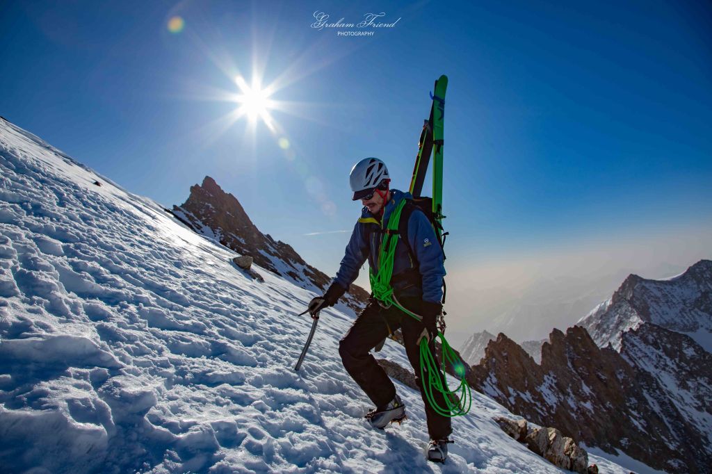 We started at 11:00pm in the village of Egga and began with a frustrating and tiring climb in ski boots, carrying our skis through rotten, soft snow to reach the Hotel Belalp. From here we descended in crampons a steep and narrow gully above precipitous cliffs (skiing seemed like a bad idea) before traversing to the glacier. Finally, we began to make steady progress and passed the hut and continued on as the terrain became increasingly steep. Conditions were excellent and with couteaux (crampons for skis) we were able to skin up the steepest of inclines.