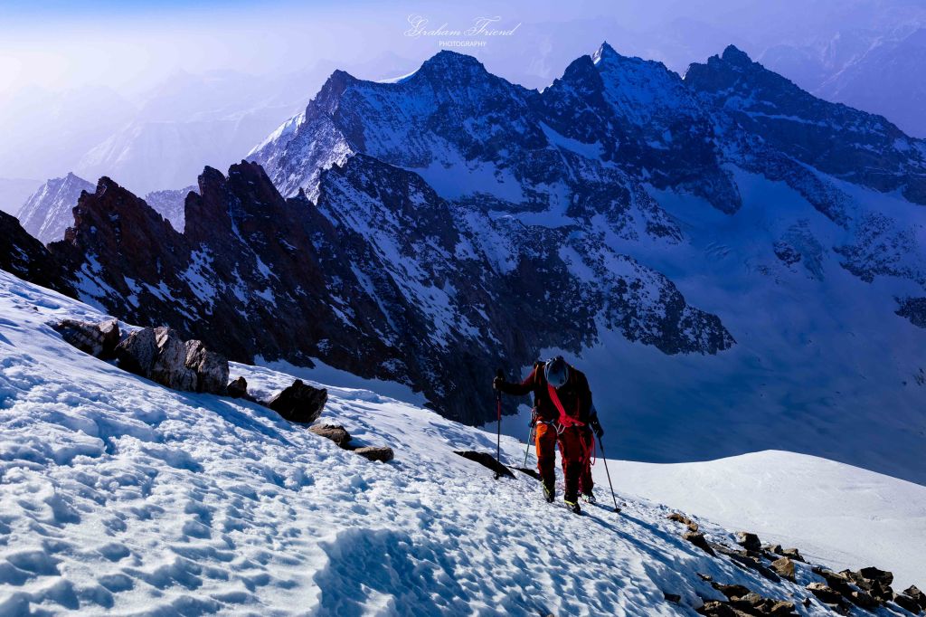 The climb to the summit was easy terrain so we climbed un-roped which allowed me to take some photos as the sun rose. I was a little stronger than Sebastian and went ahead but I was having to “chunk it down” into manageable sections, sometimes as little as mentally saying to myself “just reach that rock 10m away”. The final 450m to the summit took just under two hours and every step was a struggle. We summited after 12 hours of effort.