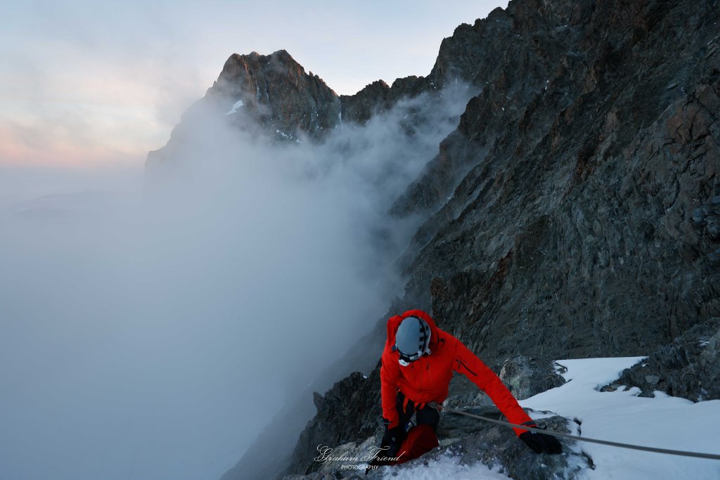 We then had to traverse a face and we were relieved that there was no snow which could have made the traverse “delicate” which I believe is a euphemism for seriously scary. It was then back on to the ridge line which continued up towards the summit. There were a few climbing moves required here and there but it was generally straightforward albeit a little cold.