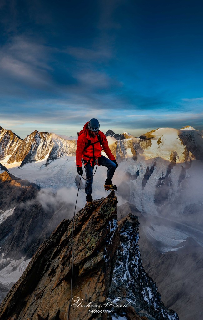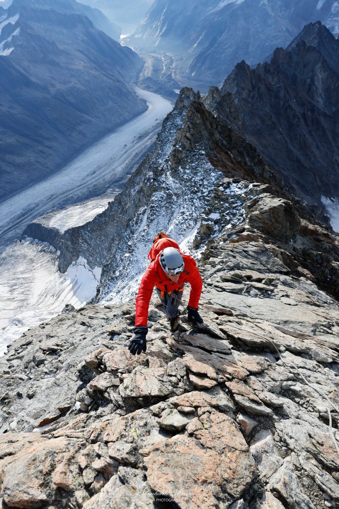Suddenly we were at the summit – the last of my Swiss peaks. I was not particularly emotional, probably because I was not with a familiar face. We shot some photos and then began the descent. With the sun now high in the sky I was able to appreciate just how ridiculously long and exposed the ridge was. We descended quickly and I was moving more confidently than usual on the knife edge ridges. It went on and on and on.