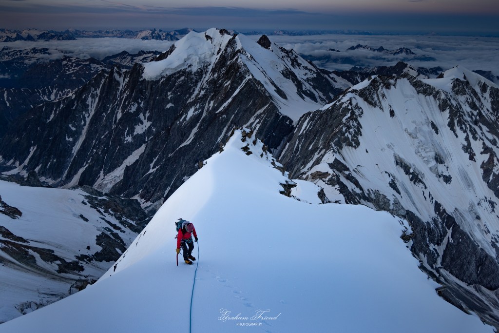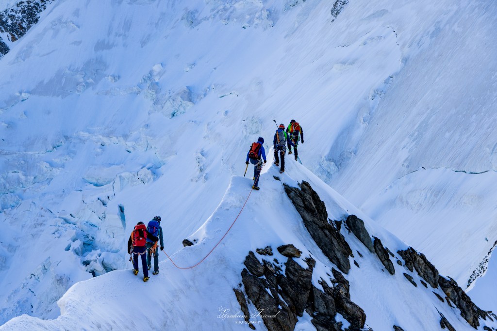 The normal exit route involves traversing the summit and following a long snowy ridge with death on either side. What I hate is knife edge, unstable rocky ridges in crampons and so this was very comfortable and we moved well. I never felt uncomfortable.
